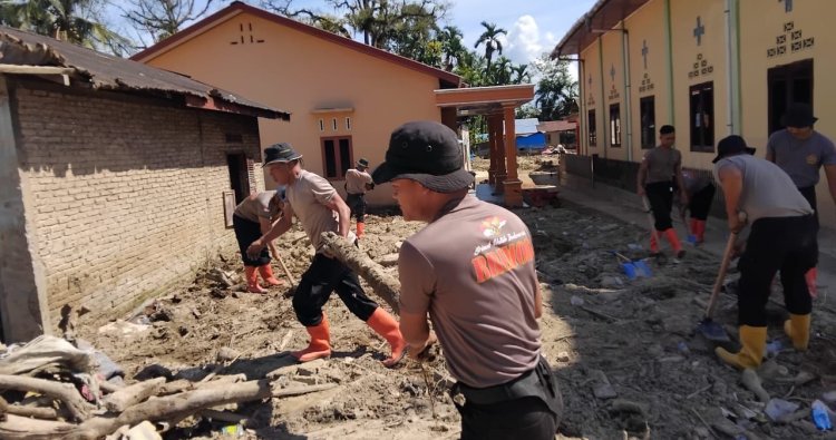 Dipimpin oleh Danton Penugasan Iptu Deny Lius Tarigan, S.H., personel Brimob bekerja secara bertahap dengan mengerahkan peralatan manual dan mesin, mulai dari cangkul, sekop, beko sorong, mesin penyedot air, hingga chainsaw, guna mempercepat proses pembersihan dan perbaikan.